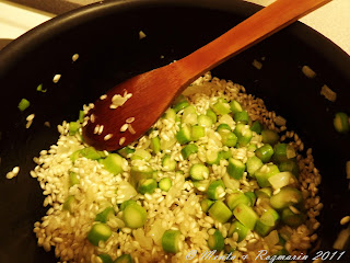 Intr-o tigaie antiaderenta, la foc mic, calim ceapa tocata marunt impreuna cu jumatate din cantitatea de unt. Cand ceapa devine transparenta, adaugam coditele de sparanghel taiate rondele si mai lasam la calit pentru inca aproximativ doua minute, dupa care adaugam orezul. Amestecam in continuare incet cu o lingura de lemn pana cand bobul de orez devine transparent, iar apoi adaugam vinul. Abia cand vinul este evaporat complet, incepem sa adaugam treptat supa. Este foarte important ca supa sa fie fierbinte, cel mai practic este sa o lasam pe aragaz, la foc foarte mic pe un ochi separat. Supa se adauga in cantitati mici cu ajutorul unui polonic, pana cand acopera in totalitate orezul si se amesteca pana cand se incorporeaza in totalitate - abia apoi se pune urmatorul polonic de supa.